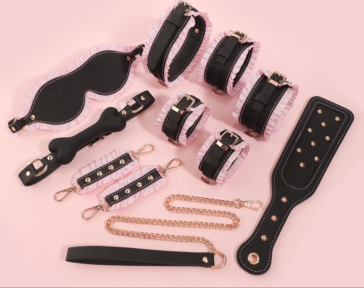 手錠、脚枷、口枷、鞭、アイマスク、首輪、収納ケース